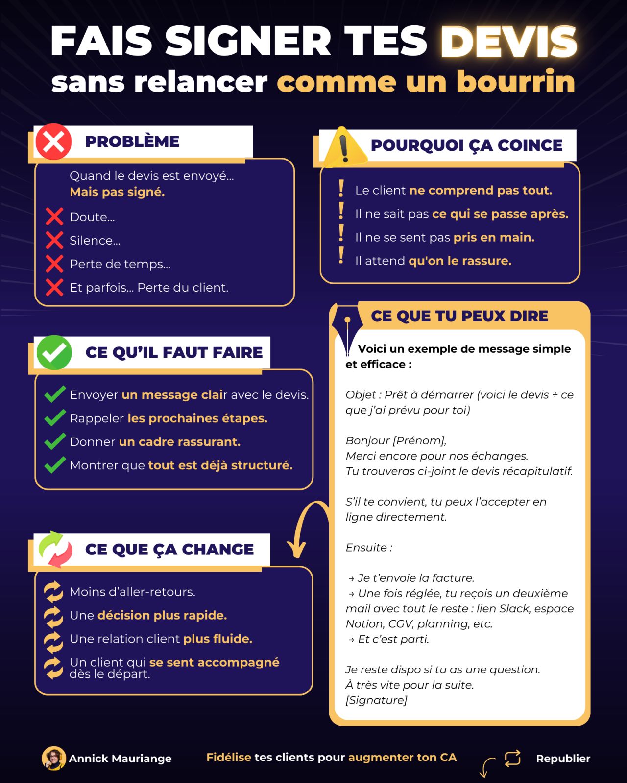 Il a reçu ton devis. Mais il n’a pas signé. Tu veux qu’il bouge ? Rassure-le ↓ Le devis est envoyé. Mais… silence radio. Tu te demandes s’il l’a ouvert. S’il a des questions. S’il a compris ce qu’il y avait dedans. Ou s’il est déjà en train de partir ailleurs. Dans ces moments-là, y’a deux écoles : → Ceux qui attendent. → Et ceux qui posent un cadre rassurant dès le départ. Et devine quoi ? Les clients, ils toujours le pro qui les sécurise. Tu veux qu’il signe ? Rassure-le. Tu veux qu’il se projette ? Montre-lui que t’as déjà prévu la suite. Pas besoin de forcer. Pas besoin de relancer en panique. Juste un message bien pensé, qui fait le lien entre ton devis… et la vraie mission qui démarre. C’est exactement ce que je travaille avec mes clients : → On structure un cadre clair, dès les premiers échanges. → On évite les flottements qui font perdre du temps et de la confiance. → On installe une relation pro, rassurante, dès l’envoi du devis. Résultat : ✓ Moins d’allers-retours ✓ Plus de réponses rapides ✓ Des clients qui se sentent pris en charge… dès le devis Tu vends une prestation ? Mais surtout, tu vends une 𝗲𝘅𝗽𝗲́𝗿𝗶𝗲𝗻𝗰𝗲. Et cette expérience commence maintenant. Et concrètement, qu’est-ce que tu lui dis à ton client ? Voici un exemple de message que tu peux envoyer avec ton devis. Il fait le lien entre ton offre et la suite du projet, sans forcer, mais en posant un cadre clair. Objet : Prêt à démarrer (voici le devis + ce que j’ai prévu pour toi) Bonjour [Prénom], Merci encore pour nos échanges, j’ai vraiment hâte de démarrer cette collaboration avec toi. Tu trouveras ci-joint le devis récapitulatif. Si tout est bon pour toi, tu peux l’accepter en ligne directement. Et pour te projeter, voici comment ça va se passer ensuite : → Une fois le devis accepté, je t’envoie la facture correspondante (paiement par virement ou CB). → Dès que c’est réglé, je te transmets toutes les infos pratiques dans un second mail : lien Slack, espace Notion, planning, CGV, etc. → Et c’est parti : on attaque ensemble dans de bonnes conditions, avec un cadre clair et efficace. Je reste dispo si tu as la moindre question. Sinon, à très vite pour la suite ! [Signature] Tu veux savoir quoi donner comme infos à tes clients pour que tout roule ? On structure ça ensemble → 20 minutes offertes pour faire le point. → https://lnkd.in/epx8cX7Z P.S. Et n’oublie pas le live de ce jeudi ! Je t’ai sélectionné 5 cas clients, dont un bien gratiné (le client toxique qui pousse le bouchon loin, très loin). Tu n’es toujours pas inscrit ? → Le lien est ici : https://lnkd.in/eSWePyRm