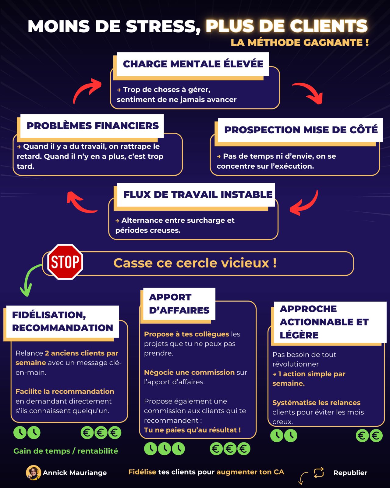 Tu bosses non-stop. Mais tu galères à te stabiliser ? Lis bien ce qui suit ↴ Récemment, un freelance développeur m’a dit : “Je suis au bord du burn-out, j’ai du mal à payer ses charges et … J’ai plus le temps de prospecter… Ni de prendre un nouveau projet…” En vrai, je vois ça chez énormément de freelance que je rencontre. “Je préfère me concentrer sur l’acquisition.” Mais aussi : ”En ce moment c’est plutôt calme”, ”J’ai du mal à trouver de nouveaux clients / missions” On croit souvent que le plus dur, c'est trouver des clients. En réalité, le vrai piège, c'est l'instabilité. • Un mois, tu es débordé. • Le suivant, c’est le calme plat. • Résultat : du stress, des finances en dents de scie, et une charge mentale qui explose. Ce cycle infernal n’a rien à voir avec ton talent ou ton expertise. C’est un problème de relation client. Pourquoi c’est un piège ? 1. Trop de choses à gérer → Fatigue, surcharge, frustration. 2. Pas le temps de prospecter → On s’occupe des urgences. 3. Trop de hauts et de bas → Alternance entre rush et vide. 4. Difficultés financières → On survit au lieu de bâtir une activité solide. Et on recommence… La clé pour en sortir ? Mieux gérer tes clients. ✓ Fidélisation & recommandation ↳ Tes anciens clients sont tes meilleurs prospects. ↳ Relance 2 clients par semaine avec un message simple. ↳ Demande-leur s’ils connaissent quelqu’un qui a besoin de toi. ✓ Apport d’affaires ↳ Tu refuses des projets ? Propose-les à des collègues. ↳ Négocie une commission pour chaque mission apportée. ✓ Approche actionnable et légère ↳ Une action simple par semaine suffit. ↳ Les relances clients doivent être automatiques, pas une corvée. ✓ Structuration & vision long terme ↳ Des process clairs = moins de charge mentale. ↳ Une bonne relation client = moins de prospection. À retenir : ✕ Travailler plus ne résout pas le problème. ✓ Mieux gérer tes clients te fait gagner du temps et de l’argent. ✓ Une activité stable commence par une expérience client bien pensée. Tu veux arrêter de subir le rythme irrégulier du freelancing ? Tout commence par ta relation client. Tu veux une activité stable ? Tout commence ici. Ne perds pas cette fiche. Et republie pour aider d’autres personnes ! Et toi, tu as déjà testé l’une de ces stratégies ? Comment ça a marché ?